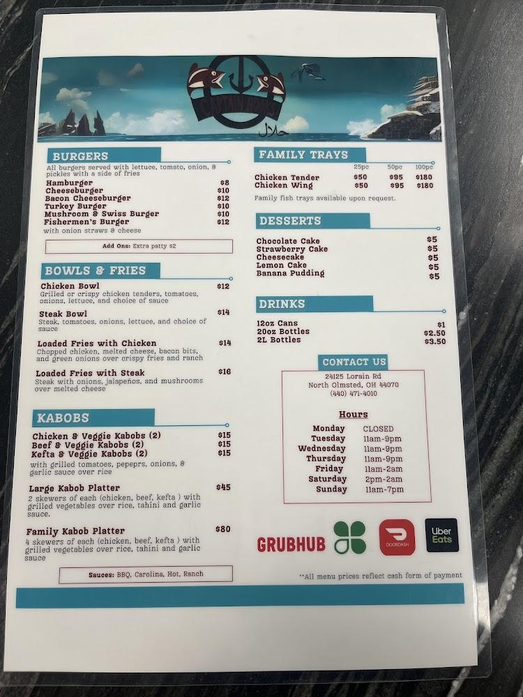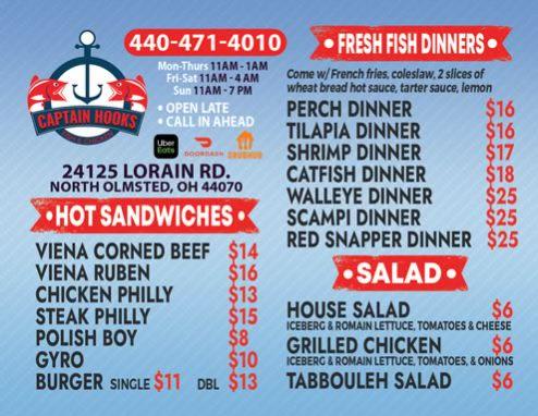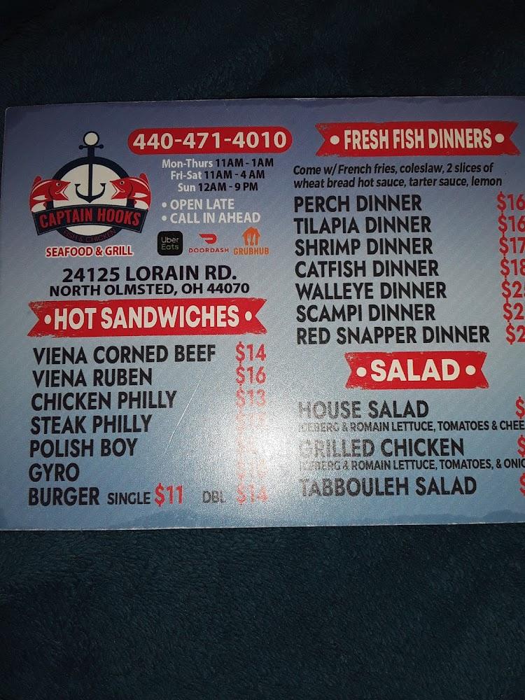 Welcome to Captain Hooks Seafood & Grill, your go-to spot for delicious, no-frills fried seafood and chicken. Located at 24125 Lorain Rd in North Olmsted, OH, we serve up a variety of mouth-watering sandwiches, soups, wings, and more. Enjoy a casual dining experience with takeout, delivery, or dine-in options available. Our affordable menu, ranging from $10 to $20, is perfect for lunch, dinner, or a solo meal. With accessible seating and amenities, we're family-friendly and ideal for a quick bite. Join us for a relaxed atmosphere and discover the flavors of traditional American seafood cuisine!